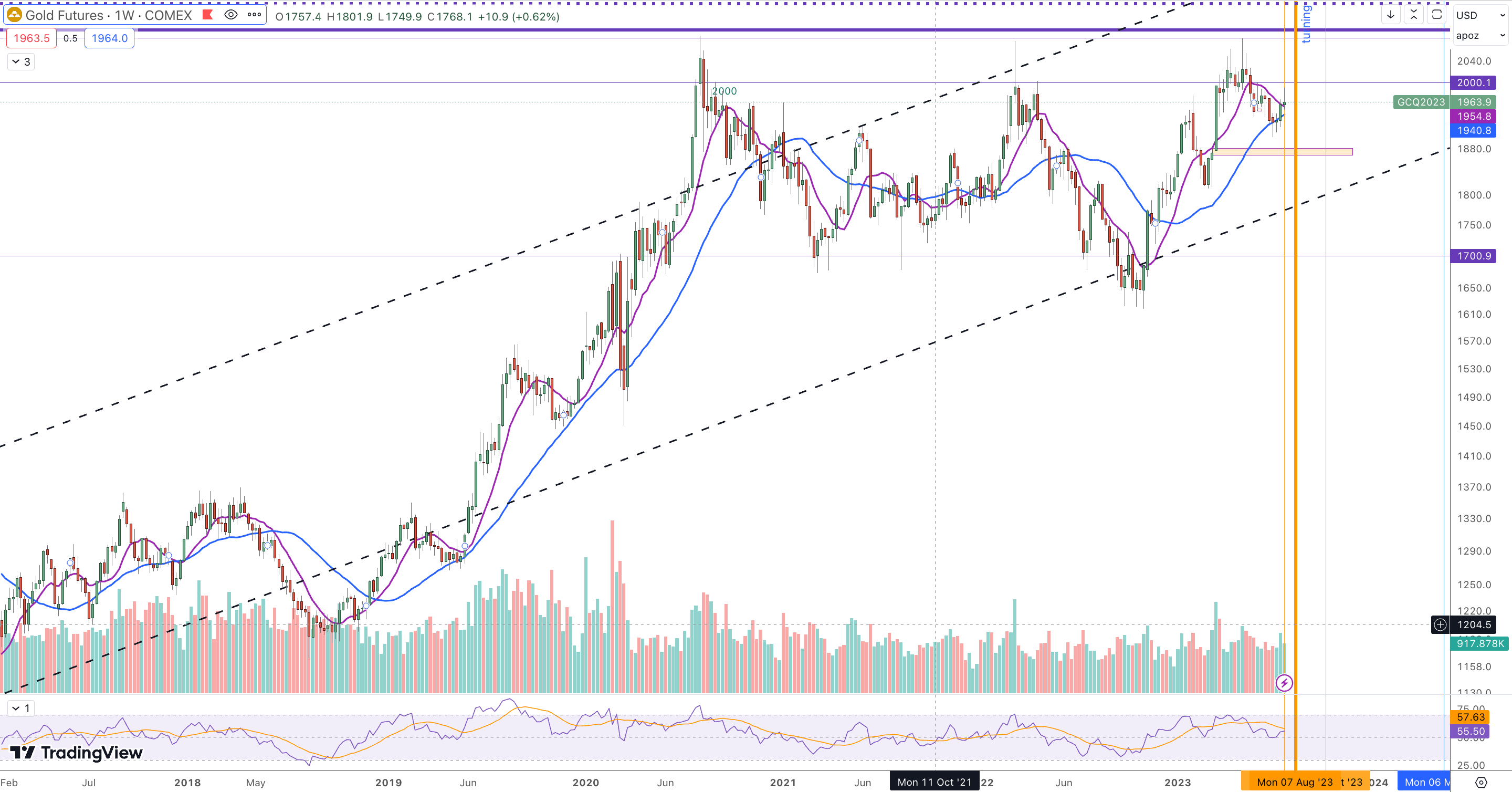 Looking at the gold futures chart we can see 3 attempts to break above 2100 hence the main resistance minor resistance stands at 2000. A break above 2100 should propel the metal to much higher value over the year.